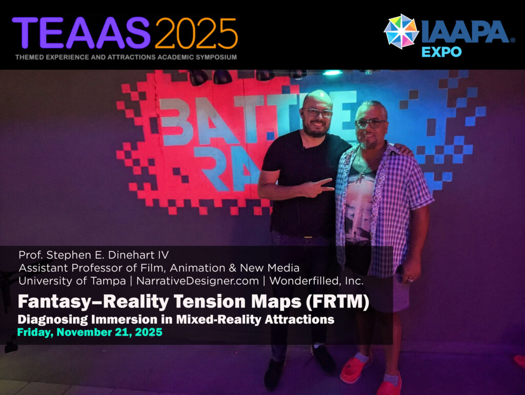 After two decades of working at the intersection of narrative design, interactive media, and themed entertainment, I'm excited to share a new research project that brings together everything I've learned about how perception, story, and technology create (or break) immersive experiences. I call it Fantasy–Reality Tension Maps (FRTM) — a diagnostic framework for identifying where immersion succeeds or fails in mixed-reality attractions.